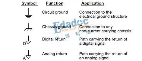 回到EMC培訓,Mark的觀點其實很清楚了,那就是地在PCB里是不存在的,它只是0v參考的符號象征。除非我們的設計或應用在操作上需要區分數字和模擬電路,且需要將兩者彼此分割,或者需要從0v參考地區分不同的功能區域如機殼和ESD地,而且就算在同一系統里使用不同的地,在系統的某個地方也需要將這幾種不同的地連接起來,并且需要EMC工程師來保障相關的連接是否可行。除此之外其他的設計都建議大家使用一個地的符號來表示0v參考。下圖是幾個常見地的表示符號及功能應用解釋,注意數字和模擬地用的是回流來形容而不是地。