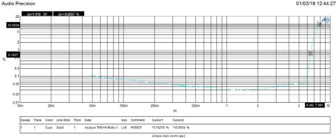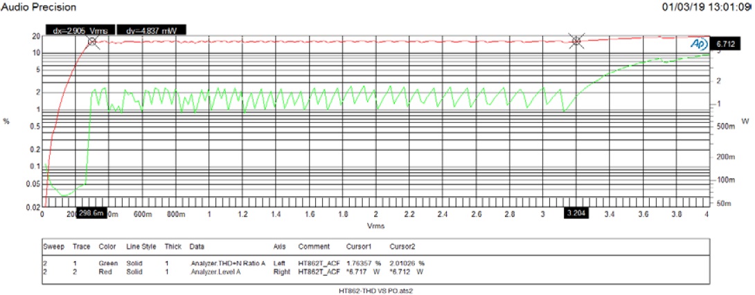 HT862T 防破音打開(kāi)輸出功率:6.71W/THD=2%