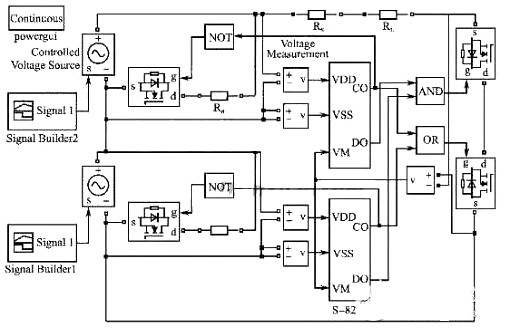 根據上述均衡充電保護板電路工作的基本原理,在Matlab/Simulink環境下搭建了系統仿真模型,模擬鋰電池組充放電過程中保護板工作的情況,驗證該設計方案的可行性。為簡單起見,給出了鋰電池組僅由2節鋰電池串聯的仿真模型,如圖5所示。