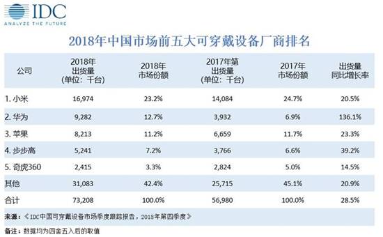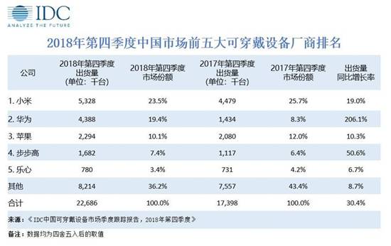 IDC《中國可穿戴設備市場季度跟蹤報告,2018年第四季度》顯示,2018年第四季度中國可穿戴設備市場出貨量為2269萬臺,同比增長 30.4%。基礎可穿戴設備(不支持第三方應用的可穿戴設備)同比增長25.0%,其中主要的增長來自于耳機產品,而智能可穿戴設備同比增長達到64.5%。
