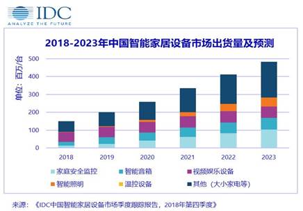 IDC最新發布的《IDC中國智能家居設備市場季度跟蹤報告》顯示,2018年中國智能家居市場累計出貨近1.5億臺,同比增長36.7%。其中第四季度出貨4610萬臺,同比增長45.4%。預計未來五年中國智能家居設備市場將持續快速增長,2023年市場規模將接近5億臺。