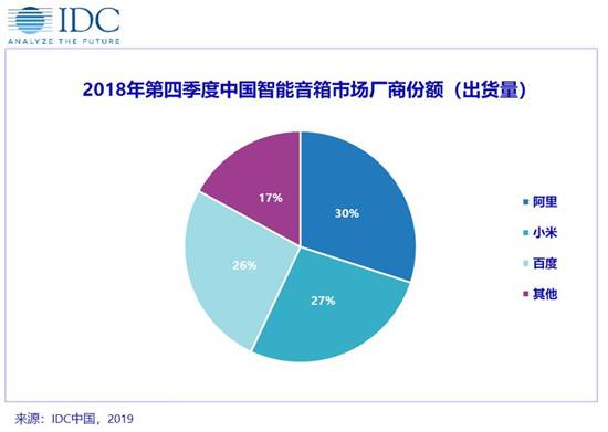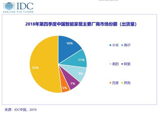 從市場競爭來看,中國智能家居設備市場玩家眾多,頭部廠商優勢明顯。《IDC中國智能家居設備市場季度跟蹤報告》顯示,2018年第四季度中國智能家居設備出貨量前五位的廠商占有近半數的市場份額。其中小米依靠其完善的生態鏈成為最大玩家;海爾和美的作為傳統家電智能化的領頭羊分列第二、三位;阿里憑借自身渠道優勢通過智能音箱和智能電視盒子兩個主要產品位列第四;百度入局較晚,但在DuerOS語音平臺的支持下通過智能音箱這一爆款產品,僅三個季度便躋身前五。