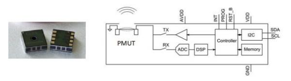 此傳感器方框圖顯示了與壓電式 MEMS 超聲波傳感器(PMUT)相連的CMOS片上系統(SoC)。