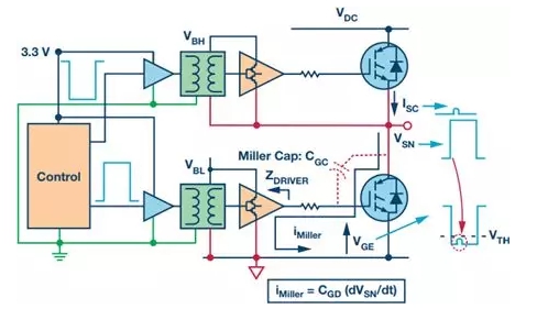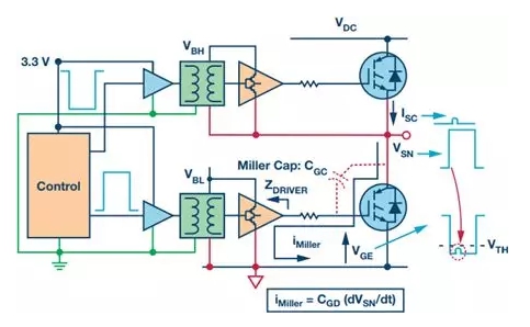 除了系統故障導致的短路,瞬時逆變器直通同樣會發生在正常工作條件下。此時,IGBT導通要求IGBT驅動至飽和區域,在該區域中導通損耗最低。這通常意味著導通狀態時的柵極-發射極電壓大于12 V。IGBT關斷要求IGBT驅動至工作截止區域,以便在高端IGBT導通時成功阻隔兩端的反向高電壓。原則上講,可以通過使IGBT柵極-發射極電壓下降至0 V實現該目標。但是,必須考慮逆變器臂上低端晶體管導通時的副作用。導通時開關節點電壓的快速變化導致容性感應電流流過低端IGBT寄生密勒柵極-集電極電容(圖3中的CGC)。該電流流過低端柵極驅動器(圖3中的ZDRIVER)關斷阻抗,在低端IGBT柵極發射極端創造出一個瞬變電壓增加,如圖所示。如果該電壓上升至IGBT閾值電壓VTH以上,則會導致低端IGBT的短暫導通,從而形成瞬態逆變器臂直通——因為兩個IGBT都短暫導通。這一般不會破壞IGBT,但卻能增加功耗,影響可靠性。
