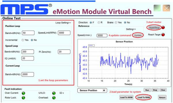 用戶只需要將MMP7xxxxx模塊與上位PC連接,然后使用鼠標操作便可以通過MPS友好的用戶界面對控制模塊的每一個寄存器進行讀寫操作,以及完成對控制程序的升級和燒寫。用戶還可以選定特點的電機輸出量后觀察將其在GUI窗口內的實時波形進行調試。MPS的動態GUI 可以讓實時硬件操作如同運行仿真一般簡便。