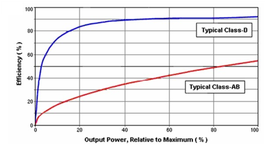 一級ECU供應商一直在信息娛樂系統音響主機單元內使用AB類音頻放大器。但AB類放大器的效率明顯低于新型D類放大器設計(見圖2)。這很重要,因為汽車的音頻放大器是音響主機單元內的第二大發熱源,緊隨SoC之后。音響主機單元箱內產生的更多熱量意味著設計人員需要包含更大的無源輻射散熱器或機械風扇。這兩種選擇都加劇了減少整體解決方案尺寸的目標。