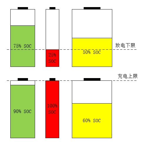 下圖是場景一,電芯的容量相同,SOC不同;其中SOC最小的電芯最先到達放電下限(假設25% SOC是下限),SOC最大的電芯最先到達充電上限;在均衡的作用下,所有電芯保持相同的SOC進行充放電。