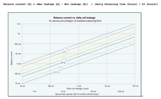 如果所有電芯的自放電一致,那么也不需要均衡;但如果不一致,自放電電流有差異時,就會造成SOC差異,均衡就是要彌補這個自放電電流差異。另外,由于每天的平均均衡時間是有限的,而自放電是每天持續的,所以時間因素也要考慮進來。上圖是按照每天不同的均衡時間,畫出的關于均衡電流與自放電電流差值的一個圖。所以如果知道了電芯的自放電率,就可以計算出一個需要的均衡電流,不過這個計算結果是一個下限值,實際的均衡能力一定要大于這個值。