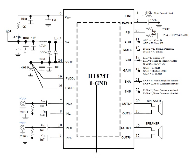 HT878 2X8.5W/2.7V-5.5V(內置自適應升壓模塊)/4Ω TSSOP-24 2.5V-5.5V 可任意限幅、單節鋰電池內置升壓的8W雙聲道音頻功放IC