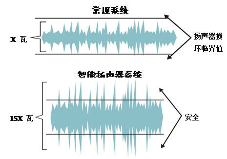 圖 3:揚聲器保護算法使揚聲器能夠輸出比傳統放大器高出兩倍的音量,同時不會損壞元器件