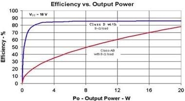 眾所周知,D類音頻放大器有很多優點,而其中最重要的一個優點就是它的效率要遠比AB類放大器的效率高,F在雖然大家都承認這一優點,但是對于其中的理解和認識還是很不相同的。不少人都認為AB類放大器的效率通常是70-80%,而D類放大器的效率則可以達到80-90%。所以D類放大器的效率大約可以比AB類放大器效率高10-15%左右。