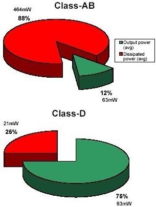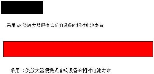 D類放大器的高效率最明顯地表現在利用電池作為電源的便攜式設備中。這通常也是這類產品的一個最大賣點。就像手機的待機時間一樣,所有便攜式音響設備,像隨身聽、MP3、等等,采用D類音頻放大器以后其工作時間就大大增加了;蛘哒f其電池的續航時間大大增加了。通常要比采用AB類放大器增加2-3倍時間。這就不是什么10%到15%的不同,而是本質上的區別。