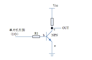 上圖所示,當I/O為高電平時(+5v),管子關閉,OUT輸出為低電平即0v;當I/O為低電平時(0v),b端電壓低于e端電壓,則管子導通,OUT輸出為≈5v,即為高電平。實際上,此時e-b端為0.7v,b端電壓為4.3v,I/O電壓為0v。從而達到了用單片機端口來控制OUT的結果。?