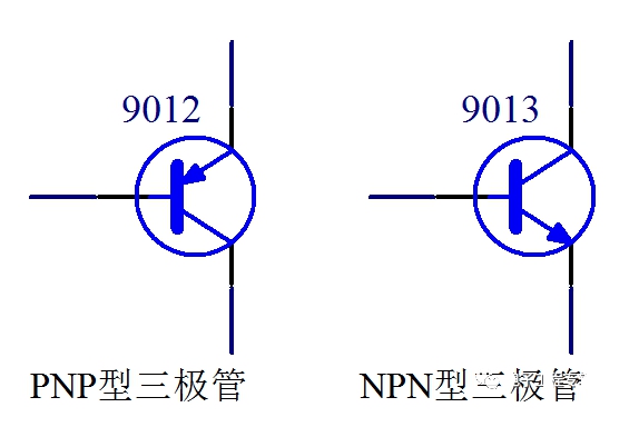 常見的三極管為9012、s8550、9013、s8050.單片機應用電路中三極管主要的作用就是開關作用。其中9012與8550為pnp型三極管,可以通用。其中9013與8050為npn型三極管,可以通用。PNP與NPN兩種三極管各引腳的表示: