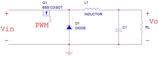 當PWM驅動低電平使得NMOS管Q1截至時,電感電流不能突變,經過續流二極管形成回路(忽略二極管壓降),給輸出負載供電,此時電感電流下降,此時電感反向伏秒為:V*Toff=Vo*(Ts-Ton)