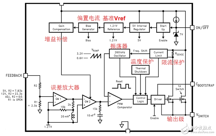誤差放大器的作用就是將反饋電壓(FB引腳電壓)與基準電壓的差值進行放大,然后再用該信號去控制PWM輸出信號的占空比。
