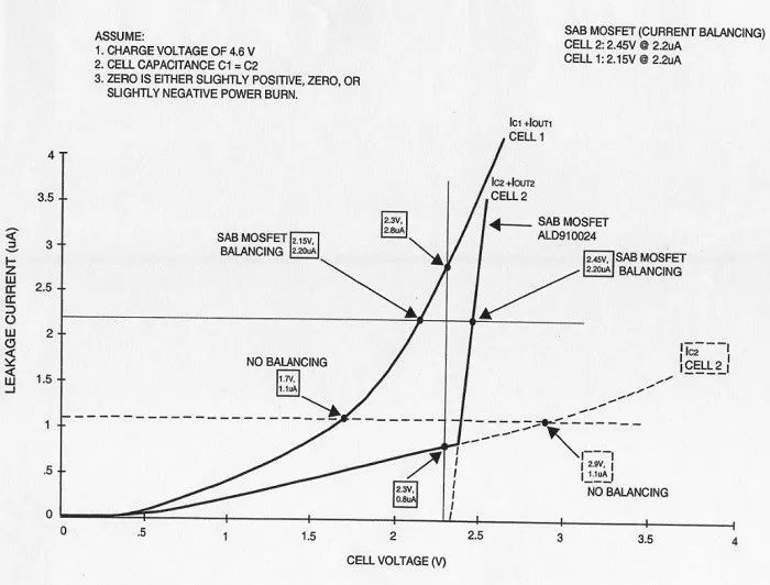 圖1顯示,在2.3 V時,上面的超級電容器漏電流為1.6μA,而下面的超級電容器漏電流為0.8μA。如果這兩個超級電容器不平衡和均衡漏電流,那么下面的超級電容器可能由于過壓而永久失效。