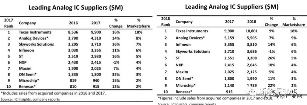 汽車電子部件上面的元件,很大比例來自于美國廠家,我們國內(nèi)的半導(dǎo)體產(chǎn)業(yè)仍處于發(fā)展階段;在網(wǎng)上找一張全球模擬芯片廠商排名,可以看出主要是歐美、日本企業(yè),而美國企業(yè)則過半;像TI、ADI、美信、ON等等都來自于美國。