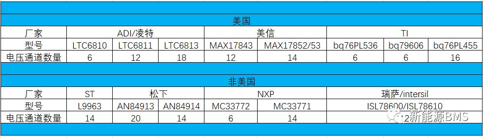 前面的文章也介紹過AFE,基本目前可利用的廠家資源如下圖所示:美國廠商的市場占有率很高,國內(nèi)稍有名氣的BMS廠商產(chǎn)品都逃不了美系的AFE;非美系廠商中,NXP和松下的AFE可能是一個合適的選擇,ST的據(jù)說今年四季度會量產(chǎn);至于瑞薩,還是屬于英特矽爾的老產(chǎn)品。除了以上,據(jù)說英飛凌的AFE也在研發(fā)中,不久即將發(fā)布。