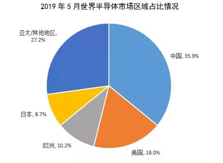 2019年1-5月世界半導體產業銷售收入為1623.3億美元,同比下降13.6%。其中:中國市場占35.9%;美國市場占18.0%;日本市場占8.7%;歐洲市場占10.2%;亞太及其他地區市場占27.2%。