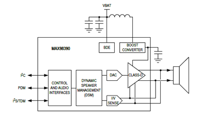 The MAX98390 is a high-efficiency mono Class-D DSM smart amplifier that features an integrated boost converter, integrated Dynamic Speaker ManagementTM, and FET scaling for higher-efficiency at low output power.