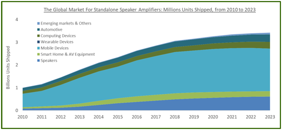 1 資料來自SAR Insight & Consulting首席研究員Peter Conney于2017年第4季度發布的音頻功率放大器報告:市場增長、通道數量、放大器類型、輸入類型、類、喇叭保護。更新數據來自SAR Insight & Consulting于2019年第1季度發布的音頻信號鏈IC預測DATAbase。