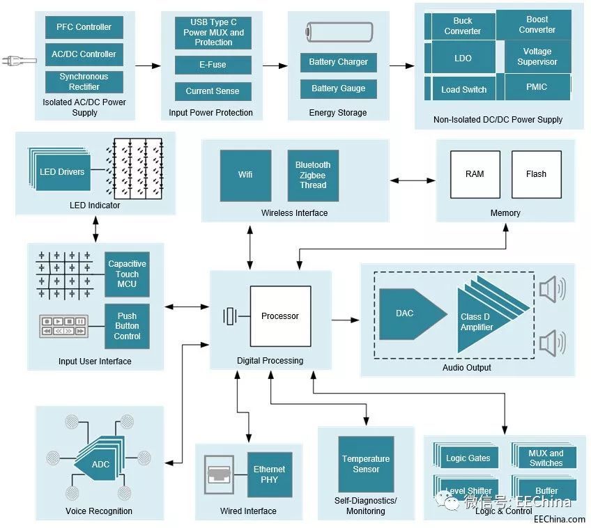 但相比于與互聯網接口結合使用的麥克風和揚聲器, 這些外形看似簡單的設備往往更復雜。智能音箱包含許多電子功能,這些功能均通過采用數十種復雜的集成電路(IC) 來實現。原始設備制造商 (OEM) 憑借差異化產品進入智能揚聲器市場,他們必須決定要提供哪些設備、如何進行提供以及此類小型低功耗設備中可采用的折衷方案。