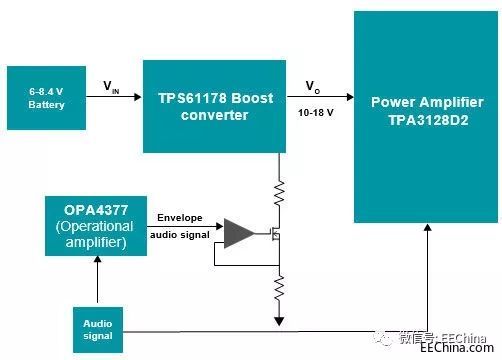 為了提高效率,您也可以根據內容動態調整放大器的輸出電源電壓。這種技術稱為包絡跟蹤。它僅在音樂 需要提高功率時跟蹤音頻內容并提高電壓(輸出功 率),特別是在重低音部分(信號內容中有許多峰值)。
