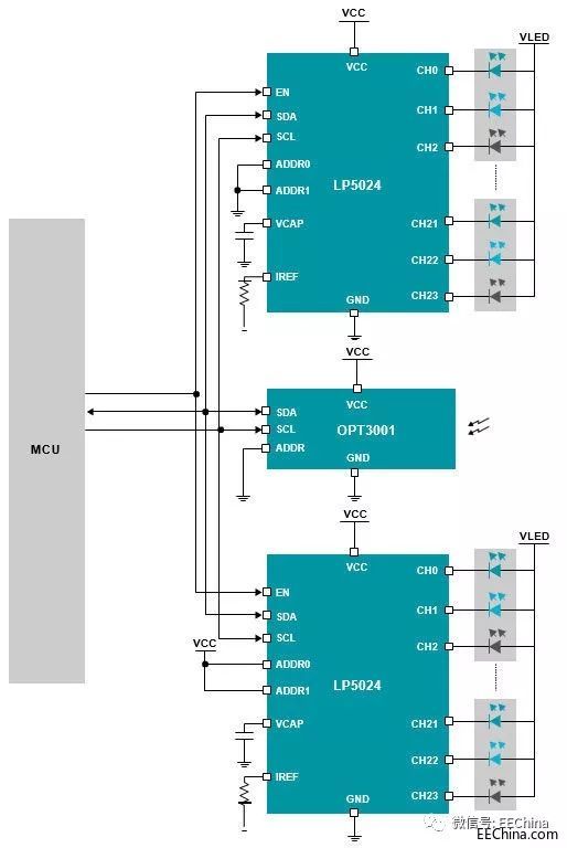 LED 基本用于指示狀態,最近也用于通過以各種圖案生成動態顏色來提高終端用戶體驗。較簡單的系統可能使用單色LED,但大部分系統使用紅、綠、藍 (RGB)LED。如果您選擇多色 LED,則需要確定使用多少個 RGB LED,以及系統處理器、MCU 或裝有集成式LED引擎的新型多LED 驅動器是否會控制它們。每種選擇均需權衡成本、電源和系統方面的考量。使用集成式LED 圖形引擎可以在處理器管理圖形生成時減輕其負擔,并在處理器或 MCU 進入低功耗待機模式時驅動RGB LED 陣列。