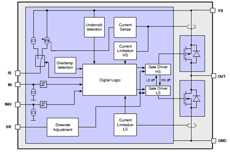 圖3. IFX007T應(yīng)用電路:一個(gè)IFX007T半橋(負(fù)載接地)