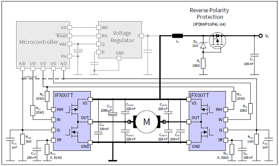 圖2. IFX007T應(yīng)用電路:兩個(gè)IFX007T H橋