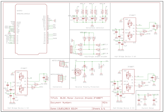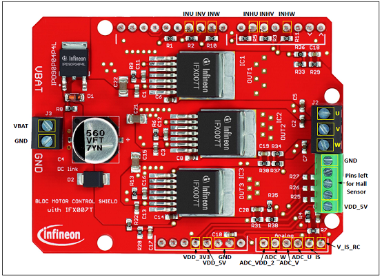 • An Arduino Uno, XMC4700 Relax Kit, or similar board connected to the shield can control the three halfbridgesvia the general IO pins.