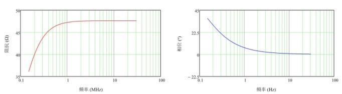 對于使用 EMI 接收器或頻譜分析儀進行的測量,噪聲信號可通過高通濾波器網絡(如圖 3 所示)獲得,該網絡的耦合電容為 0.1μF,放電電阻為 1kΩ,測量端口的端接電阻為 50Ω 。圖 4 顯示了在 150kHz 至 30MHz 的頻率范圍,(50μH + 5Ω) || 50Ω LISN 的模擬阻抗圖。
