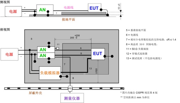 AN 直接安裝在基準接地平面之上,AN 外殼與接地平面相連。電源回流線還與電源和 AN 之間的接地平面相連。將 EMI 接收器連接到相應 AN 的測量端口可確保成功測量每條電源線上的傳導發射。與此同時,插入另一條電源線的 AN 的測量端口端接 50Ω 負載。