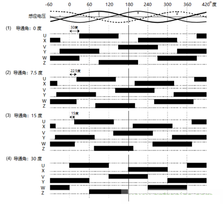 一般來說,特別是無刷電機BLDC梯形波控制算法,在電機高轉(zhuǎn)速情況下,需要在每個換相點前對6個PWM輸入信號(U~Z)插入一定的Lead Angle超前角/導(dǎo)通角,圖4是不同超前角/導(dǎo)通角,從0度、7.5度、15度到30度,所分別對應(yīng)的輸入信號。