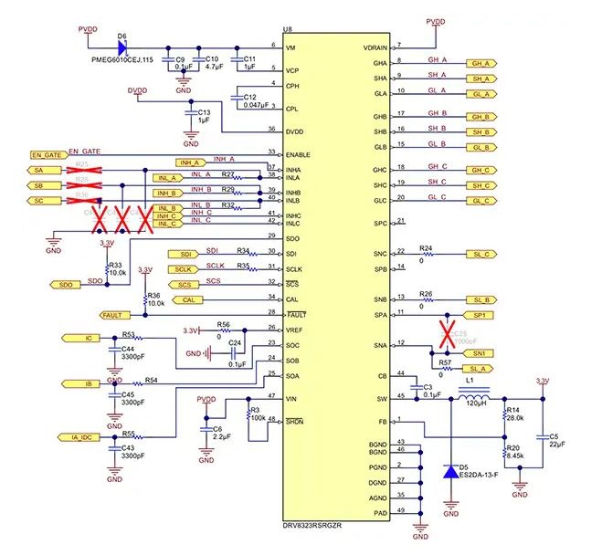 一般來(lái)說(shuō),好的設(shè)計(jì)思路是盡量減少高壓側(cè)和低壓側(cè)柵極驅(qū)動(dòng)器的回路長(zhǎng)度,其主要目的是減少 EMI。高壓側(cè)回路是從 DRV8323 GH_X 到功率 MOSFET,并通過(guò) SH_X 返回。低壓側(cè)回路是從 DRV8323 GL_X 到功率 MOSFET,并通過(guò) GND 返回。