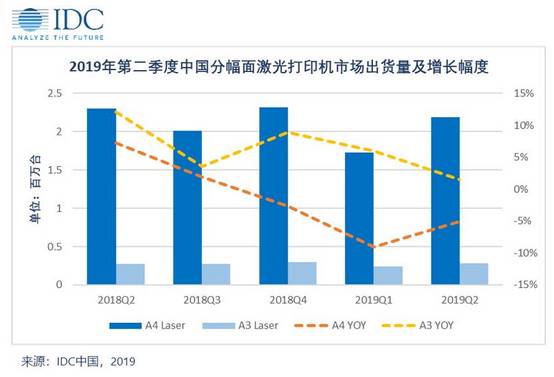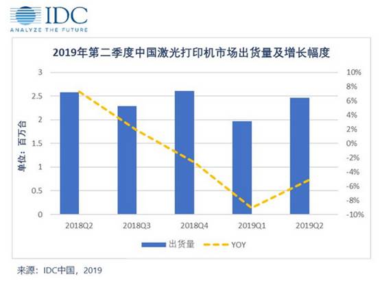 IDC《中國打印機市場季度跟蹤報告》顯示,自2018年第四季度開始,中國激光打印機市場呈現(xiàn)持續(xù)下滑態(tài)勢。2019年第二季度,激光打印機出貨量近247萬臺,同比下降4.4%。受經(jīng)濟(jì)大環(huán)境下行及政府政策的影響,用戶出于成本控制或觀望政策走向的考慮,采購需求有明顯下滑。