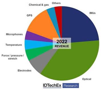 總而言之,本報告的可穿戴技術研究跟蹤了42種不同的可穿戴產品類型。IDTechEx通過在該領域多年的研究積累,提供了9大產品組21種可穿戴傳感器的出貨量、價格和營收預測,2022年的細分市場營收預測如下圖所示: