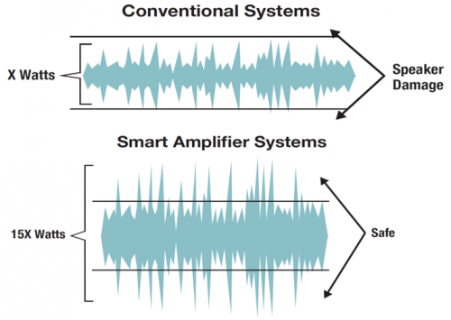 圖 3:揚(yáng)聲器保護(hù)算法使揚(yáng)聲器能夠輸出比傳統(tǒng)放大器高出兩倍的音量,同時(shí)不會(huì)損壞元器件