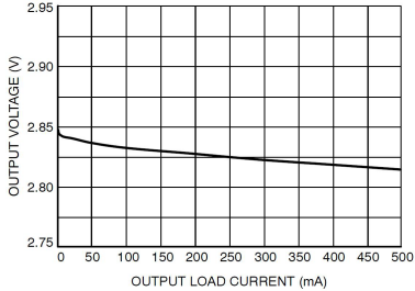 這里VMAX為測試過程中LDO的最大輸出電壓,VMIN為最小輸出電壓,VOUT為標稱輸出電壓。通過式子,可以知道LDO的負載調整率越小穩壓能力越出色。圖3為某LDO負載調整曲線,通常來說隨著輸出電流的增大輸出電壓會有所下降。