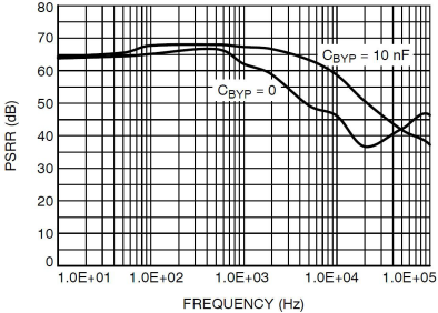 2. 為了降低輸出噪聲提高PSRR,在LDO的BYP引腳處接入合適的旁路電容;