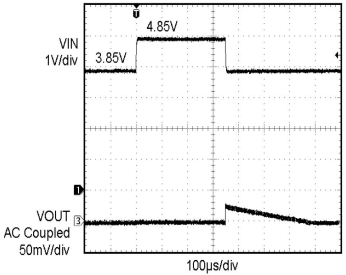 在LDO應用中,輸入電壓和輸出負載有時候會有劇烈的變化。LDO的輸入端可能會因為供電設備的電壓波動而造成LDO的輸入端電壓劇烈變化的情況。輸出端可能會出現輸出負載的切換,出現某部分負載啟動或停止等情況。這些情況都會造成LDO輸出電壓產生波動。我們可以通過LDO的瞬態響應曲線來了解LDO在遇到輸入電壓或負載電流在劇烈變化時LDO輸出電壓的變化情況。具有良好瞬態響應的LDO,在輸入電壓或負載電流在劇烈變化時,LDO的輸出電壓波動幅度小,恢復時間快。圖6為某LDO線性瞬態響應曲線,當輸入電壓波動1V時,輸出電壓也跟著波動約25mV,然后電壓逐漸恢復。圖7為某LDO負載電流突然從0.1mA切換為500mA時,輸出電壓瞬間會跌落約40mV然后有所恢復。