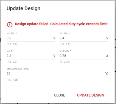 由于最小VIN低于VOUT,設計更新失敗。此設計未通過WEBENCH的首檢。