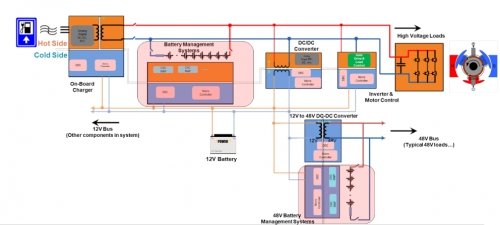 圖1:典型性的含有OBC、BMS、DC/DC、逆變電源和電機控制的HEV/EV系統圖