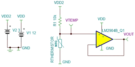 圖7:應用NTC熱敏電阻器和運算放大器開展溫度感測