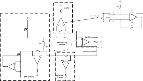 互鎖是1個工作電壓和電流量控制回路系統軟件,流過HEV/EV系統軟件中的一連串分系統,如圖所示8圖示。互鎖從BMS起動并歷經逆變電源、DC/DC轉化器、OBC再回到BMS,以檢測一切偽造、開啟髙壓系統軟件或開啟維護保養艙口的惡性事件。小車髙壓互鎖參照布置表述了互鎖系統軟件怎樣斷掉高壓線路以避免碰傷。