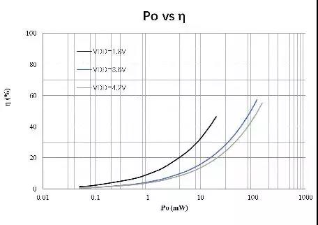 HT97180支持更低的電源供電,實現相同功率下更高的效率,從而延長便攜式電池設備的播放時間。如在耳機聽音較長使用的5-10mW區間內,如下圖所示,在HT97180在1.8V供電時,比其他同類競品使用鋰電池直接供電情況下,效率提升了約一倍,播放時間可延長約一倍的時間。