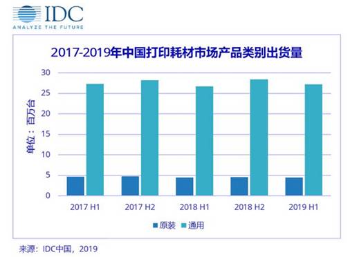 IDC《中國打印耗材市場季度跟蹤報告》的最新研究顯示,2019年上半年中國激光打印機耗材總出貨量達到3451.9萬支,原裝品牌和通用耗材品牌的市場份額分別為14.2%和85.8%。通用耗材依托優異的性價比遠遠拉開了原裝耗材的銷量。對比上半年50.2億元人民幣的銷售額,IDC發現,原裝與通用的市場份額分別為55.7% 和 44.3%,凸顯了在現有的市場競爭中,原裝耗材銷售額總量依然領先于通用市場。而從激光市場打印機保有量來看,其年復合增長率達到了9.1%。