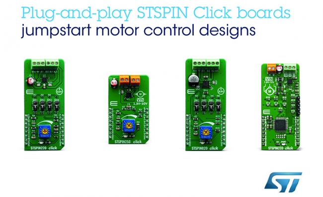 2019年10月10日——意法半導體(ST)與ST授權合作伙伴MikroElektronika合作,開發出四款Click board™開發板,將STSPIN電機驅動器的優勢擴展到STM32開發板以外的開發平臺,讓使用MikroElektronika原型板以及其它板載mikroBUS™插座的系統的用戶也能享受STSPIN電機驅動器的各種好處。
