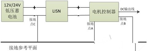 圖4、測試系統模型圖(接地點C是測試標準要求的:低壓蓄電池負極接地)